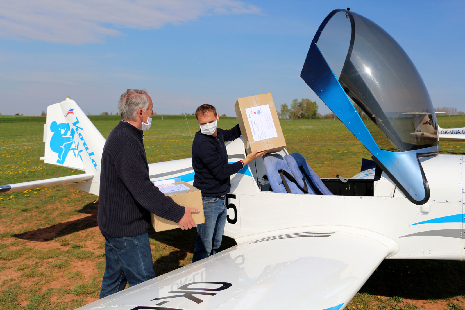 Fotogalerie z letecké zásilky materiálů ke kompletaci ochranných štítů na SPŠ Trutnov ze dne 28. 4. 2020.