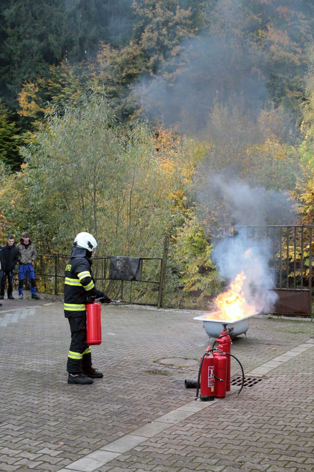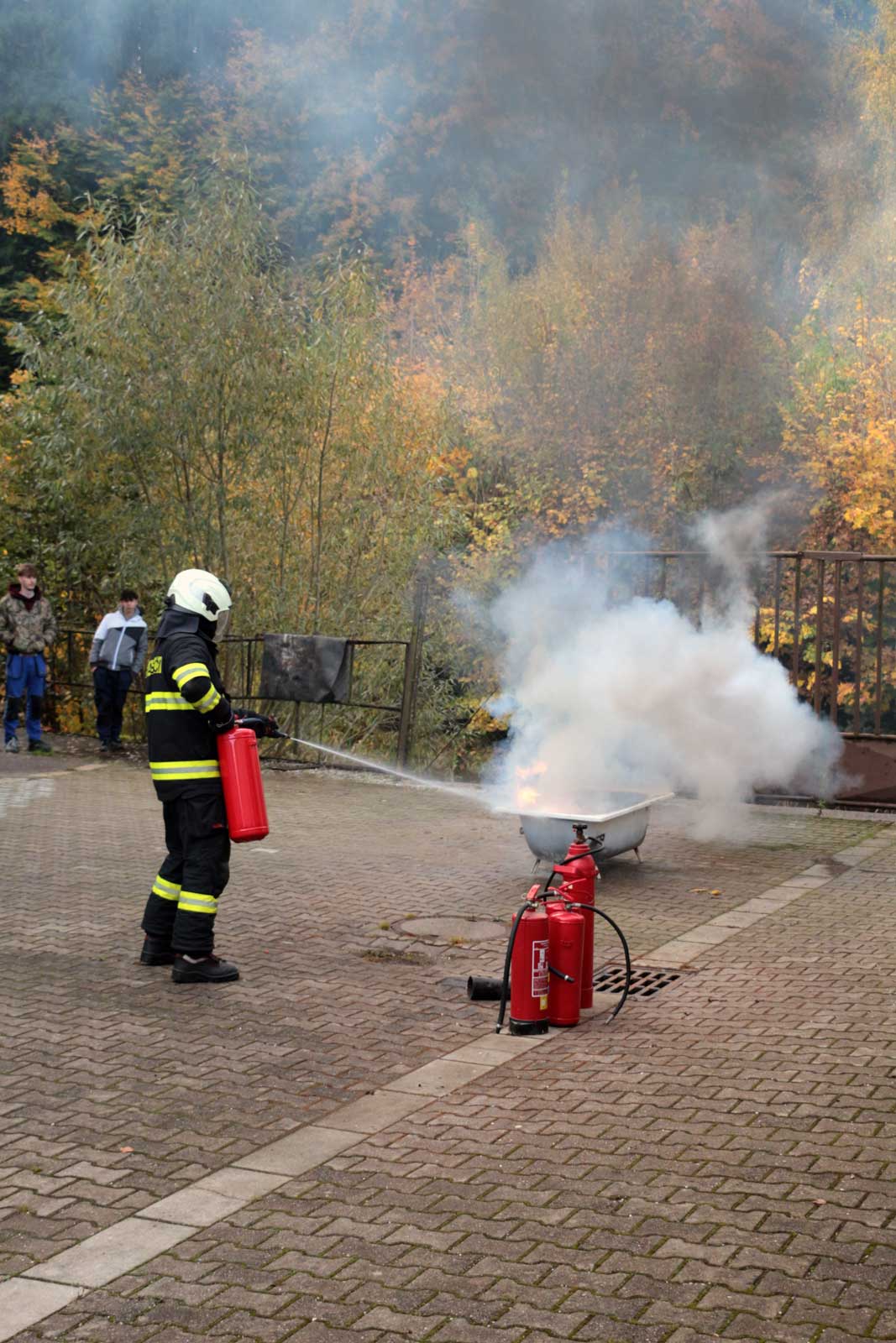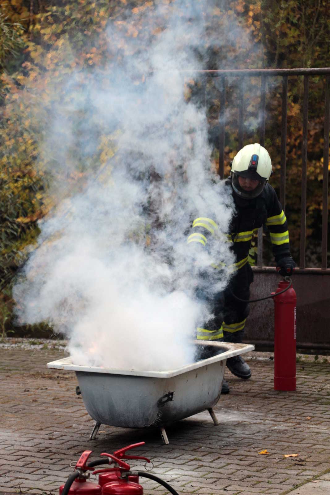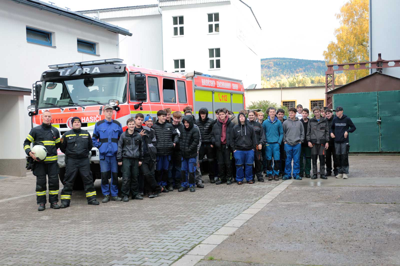 Fotogalerie z požárního školení žáků SPŠ Trutnov profesionálními hasiči z trutnovské stanice HZS Královéhradeckého kraje v říjnu 2025.