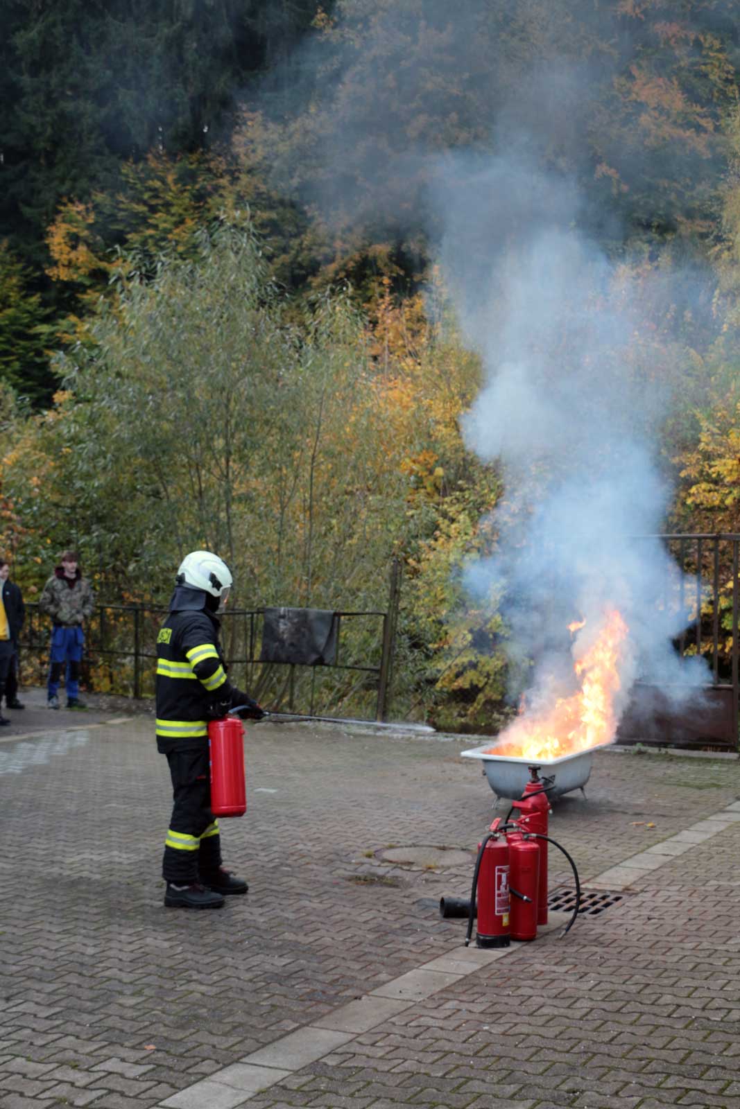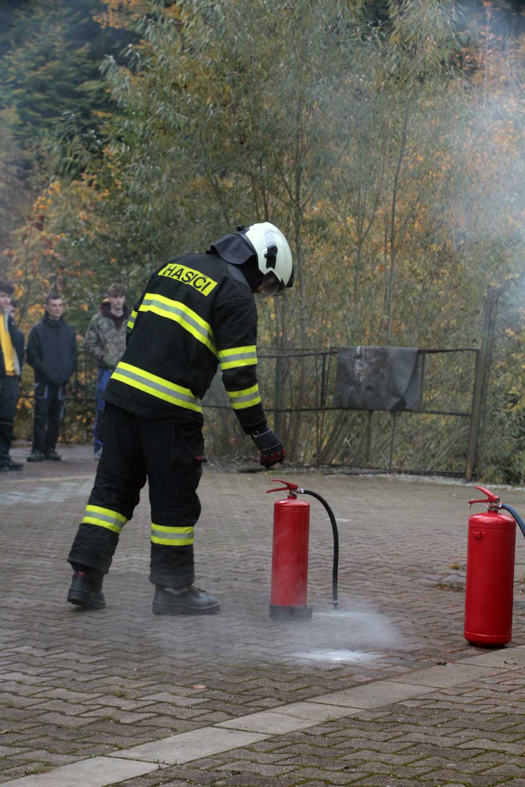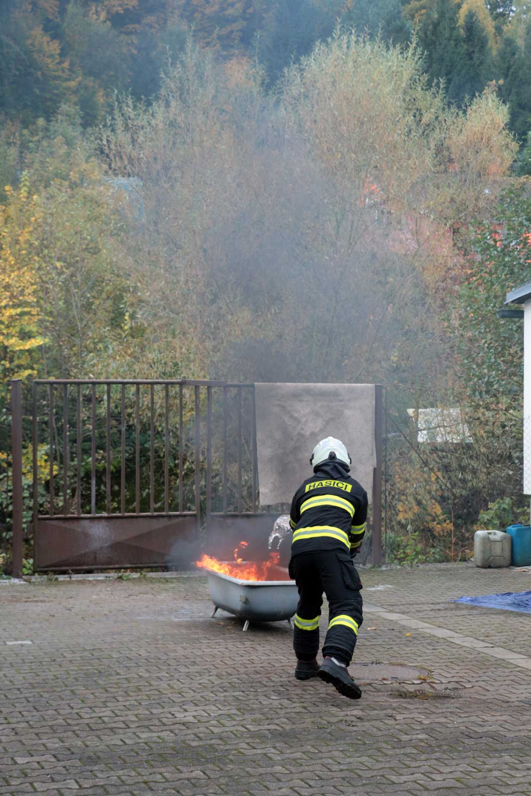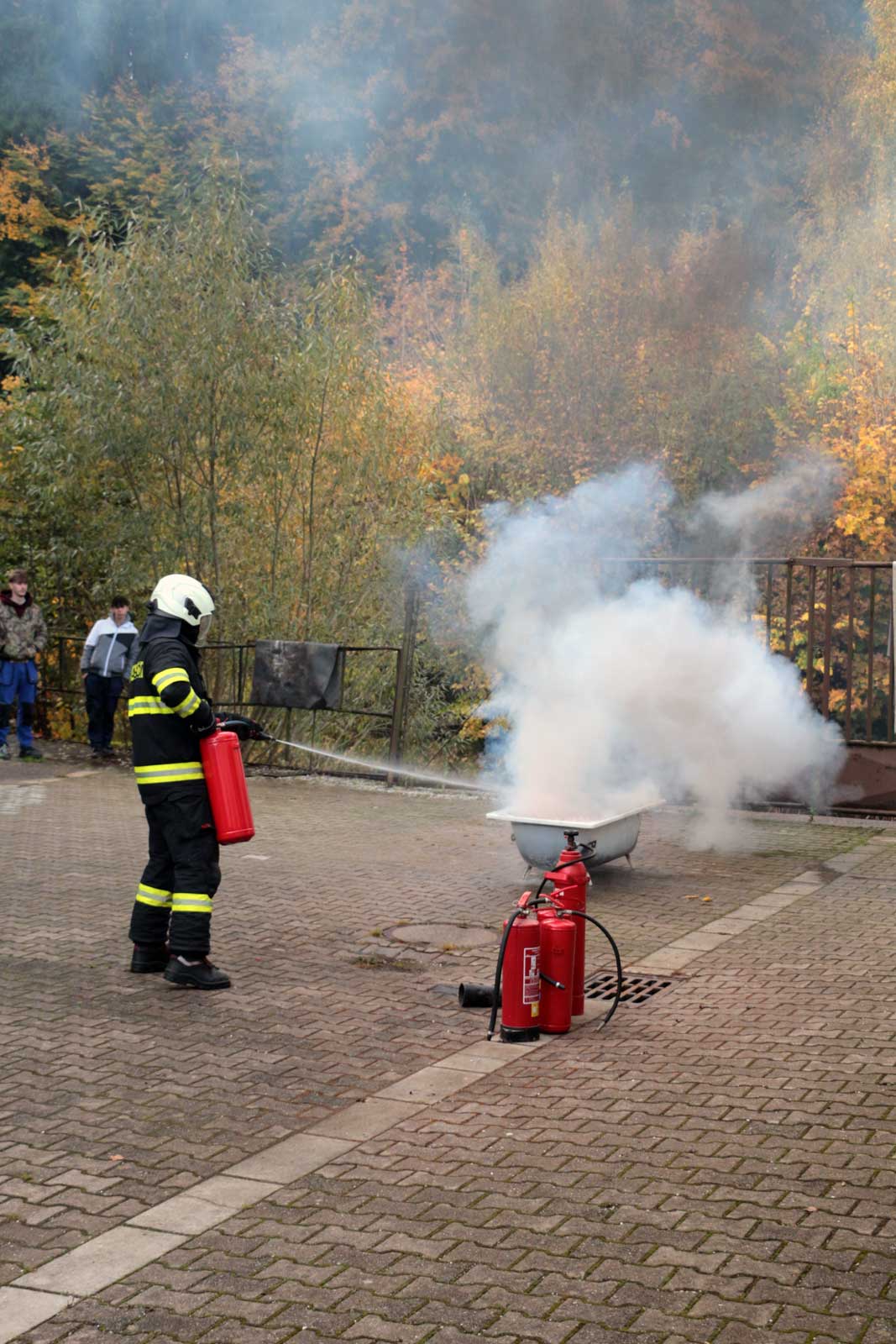 Fotogalerie z požárního školení žáků SPŠ Trutnov profesionálními hasiči z trutnovské stanice HZS Královéhradeckého kraje v říjnu 2025.