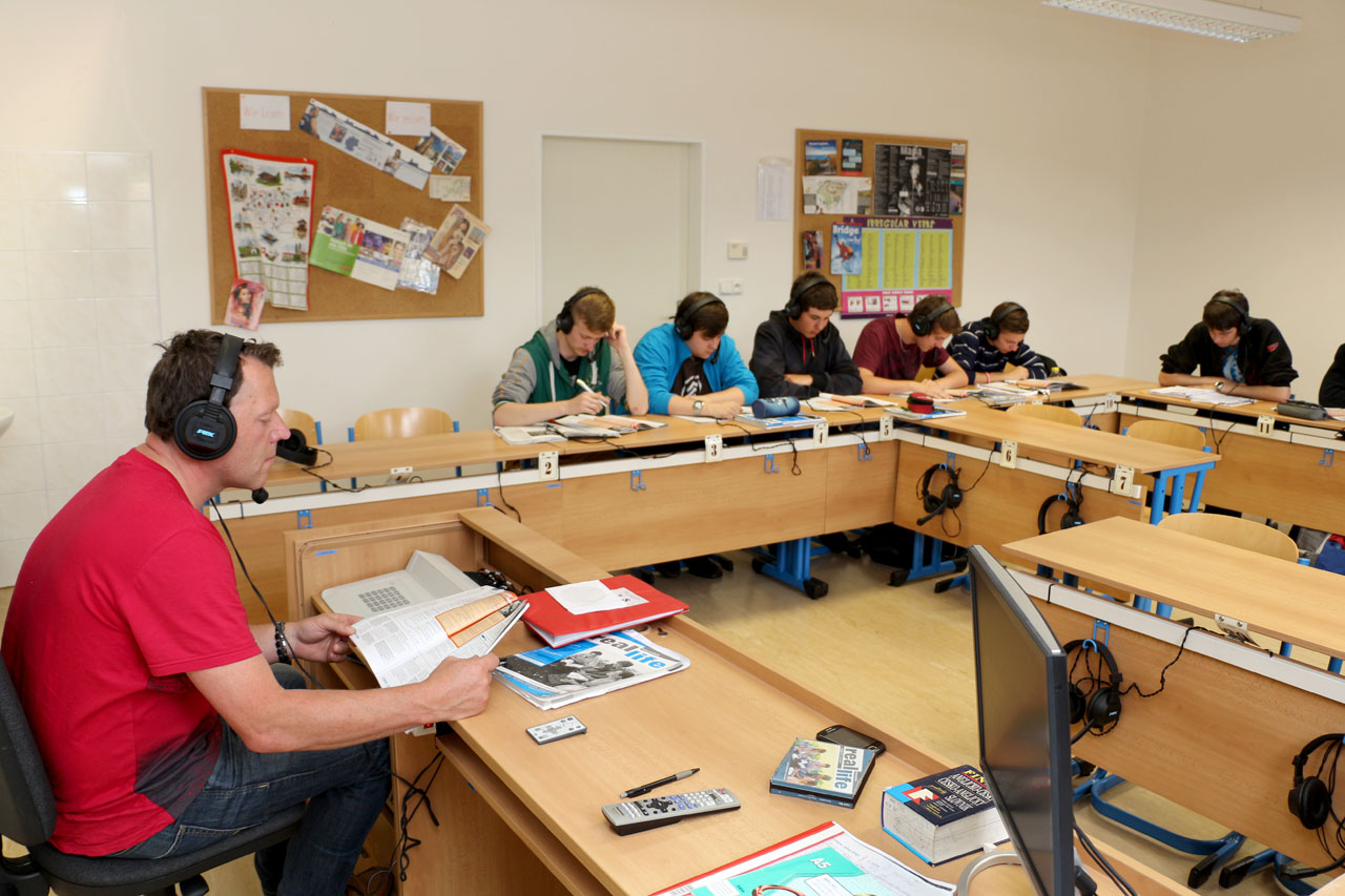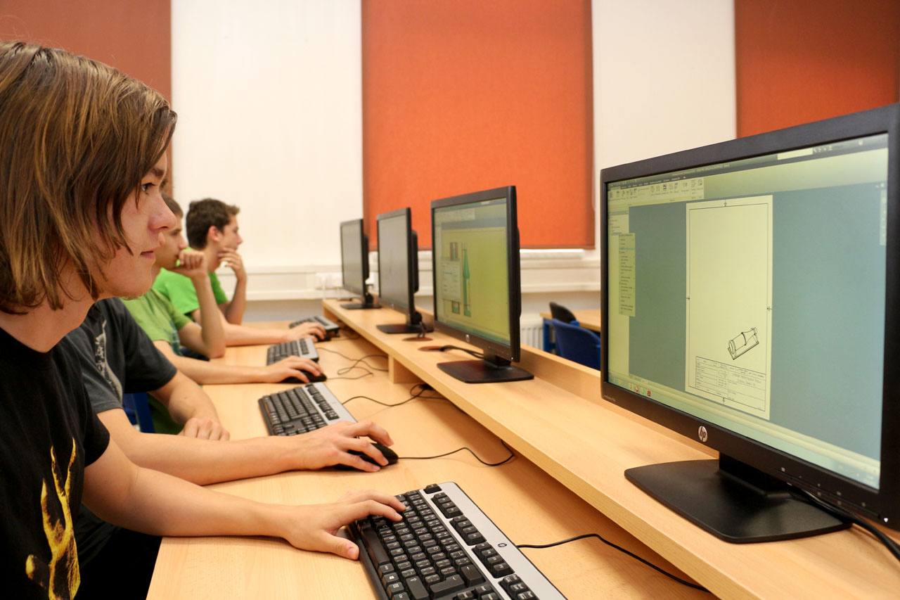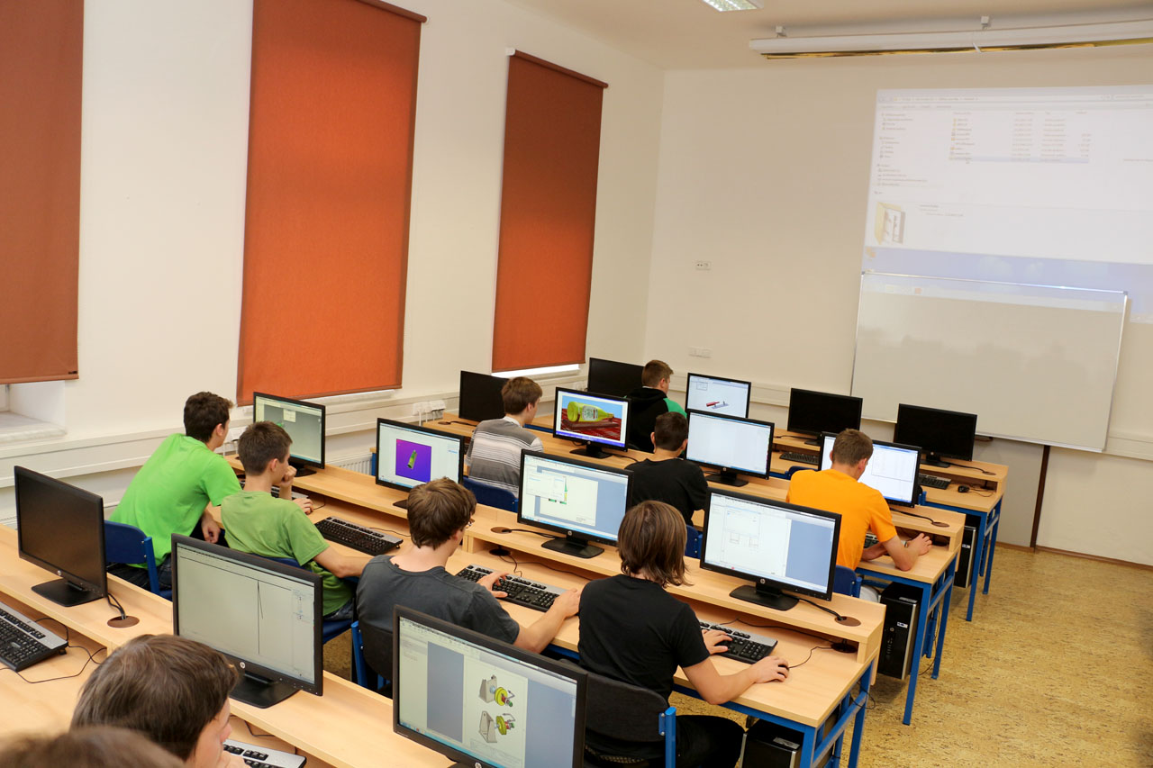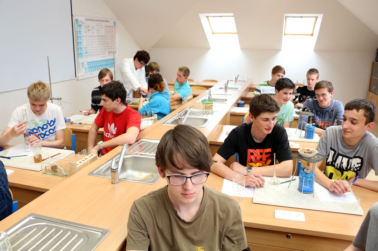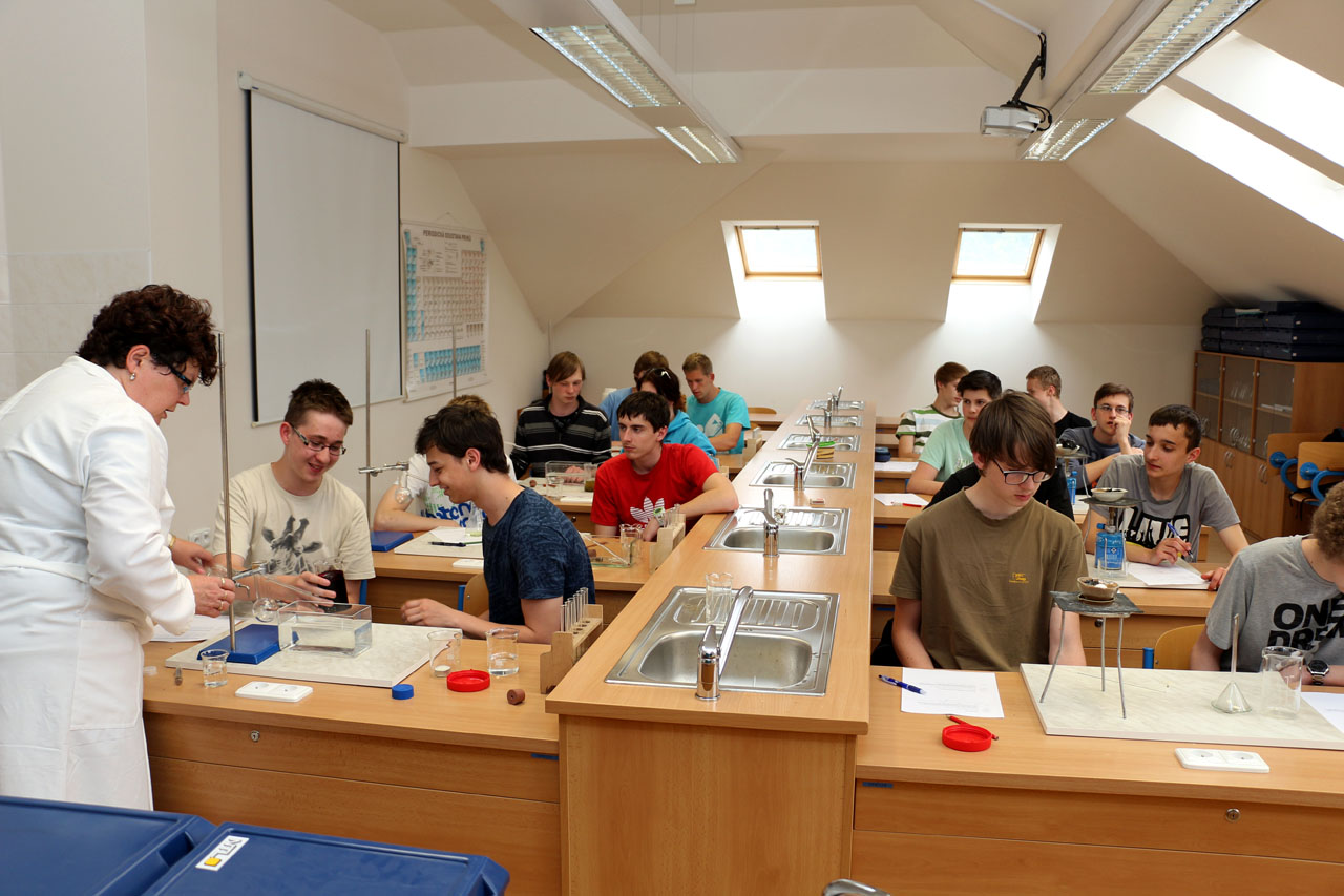 Fotografie z učeben a laboratoří školy.