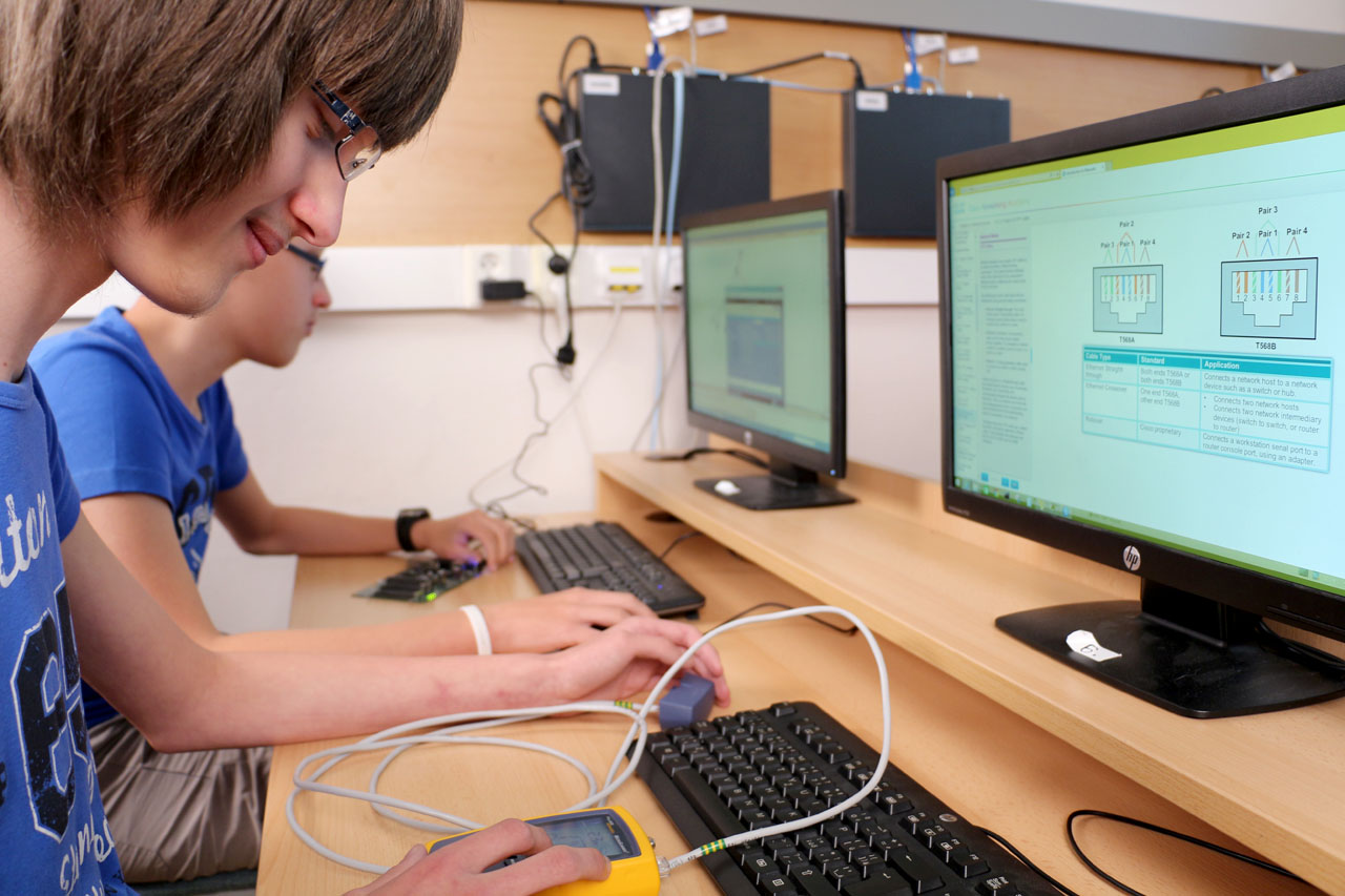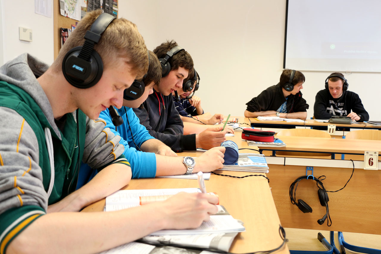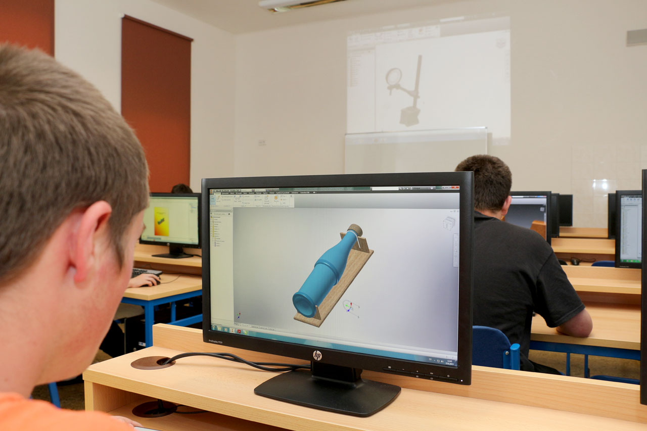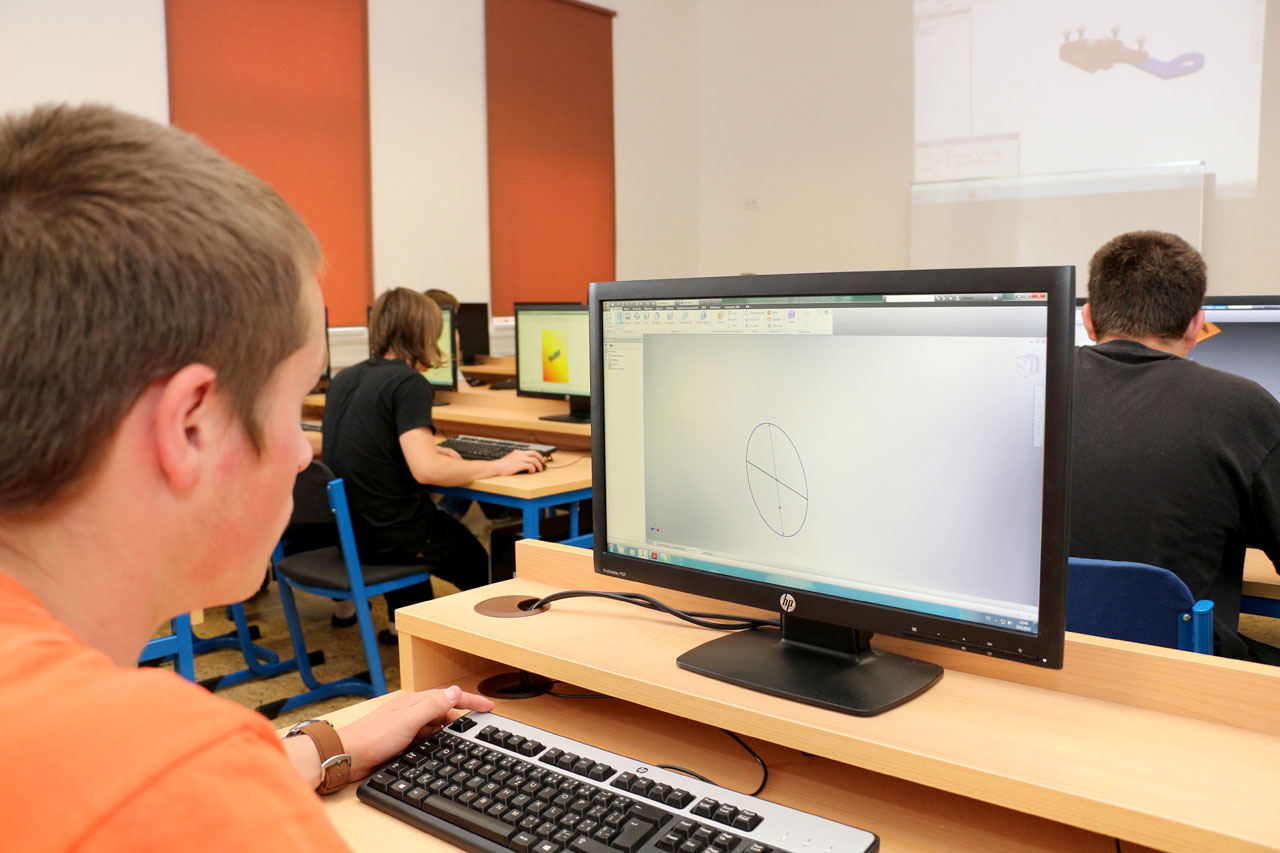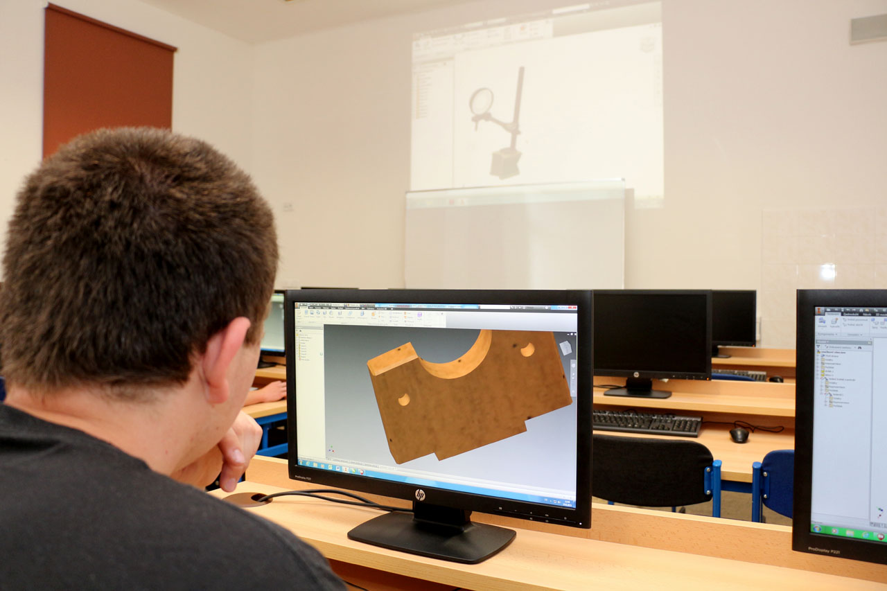 Fotografie z učeben a laboratoří školy.