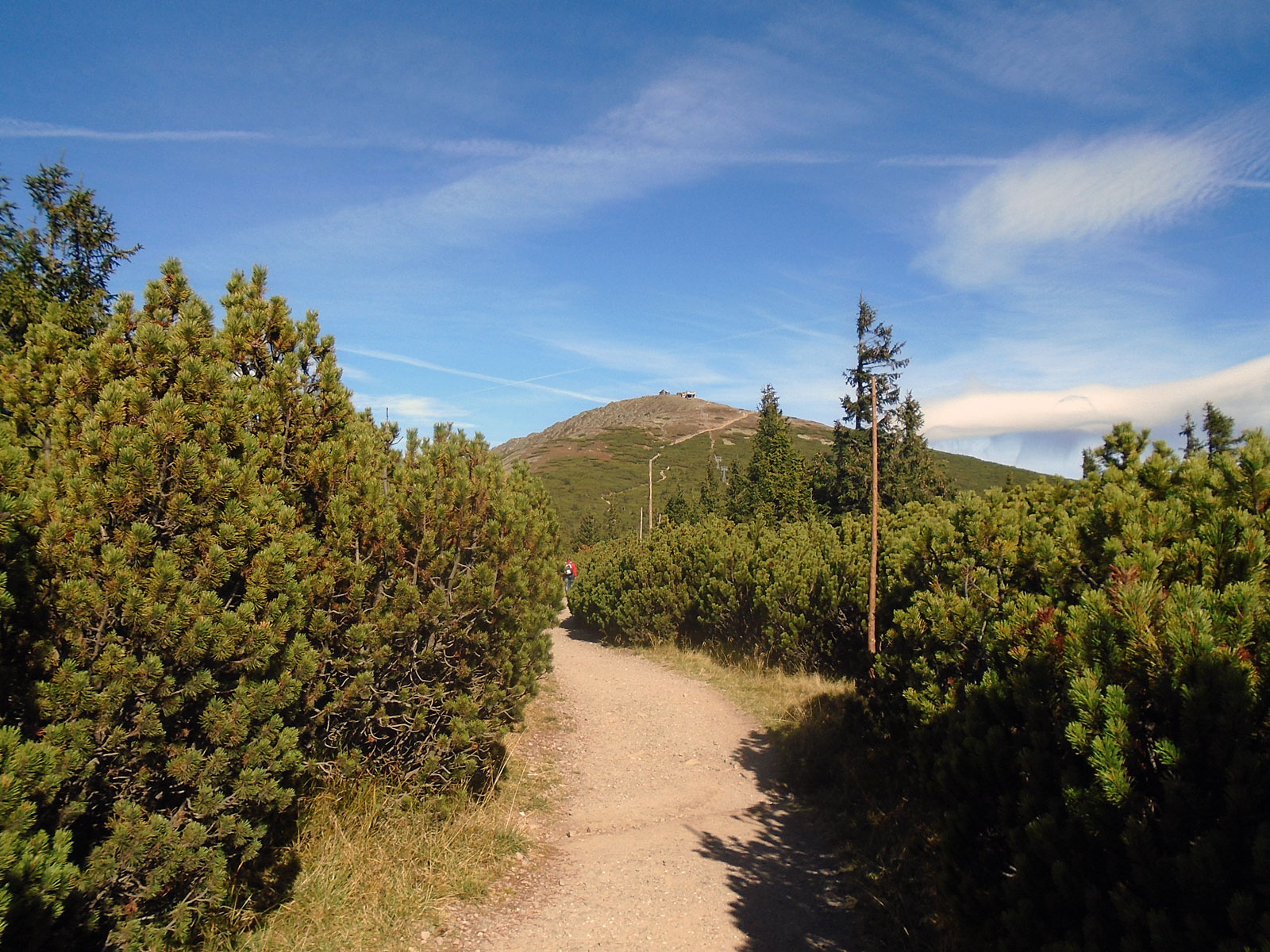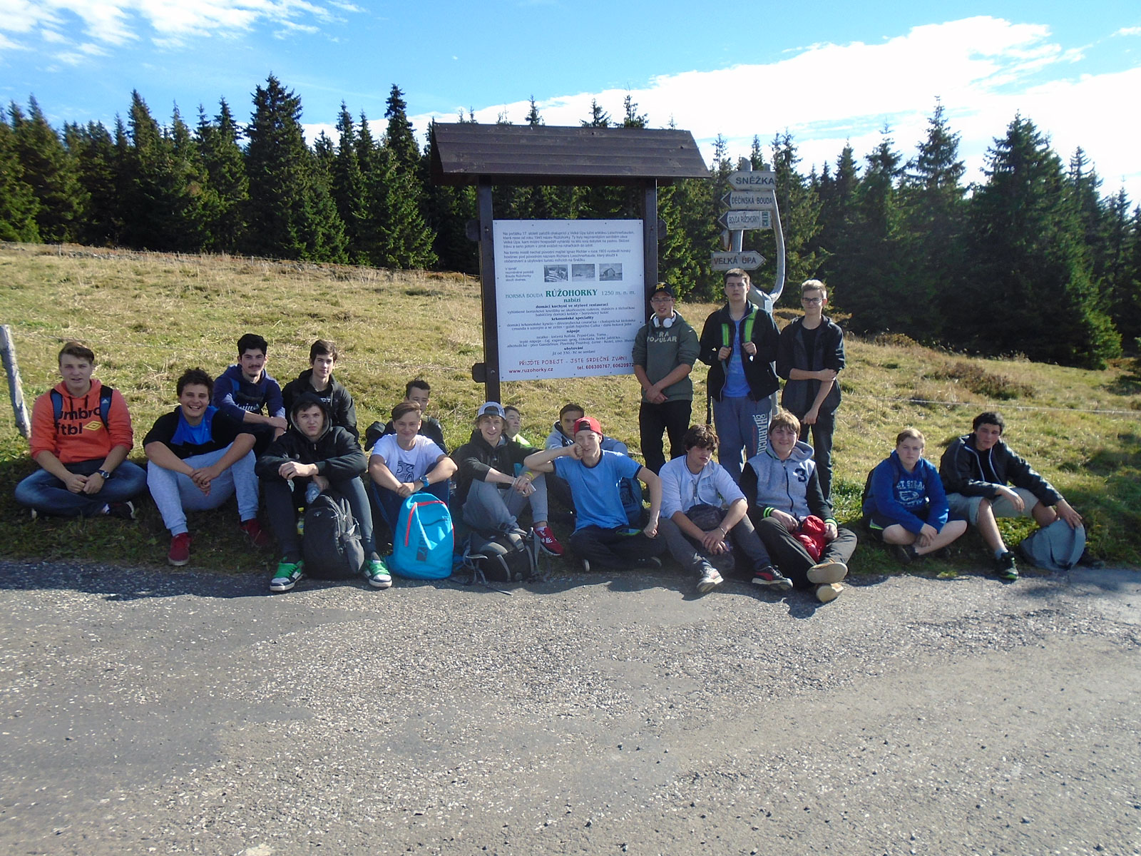 Počasí bylo ideální pro horskou turistiku do chvíle, než jsme dorazili na Sněžku. Přes krásný výhled, dosahoval vítr rychlosti až kolem 90 km/h. Byl dost nepříjemný a pro zpocená záda i studený. I přesto jsme na našem nejvyšším vrcholu nějakou dobu pobyli a samozřejmě pořídili společné foto pro paměť budoucím generacím i nám samým.