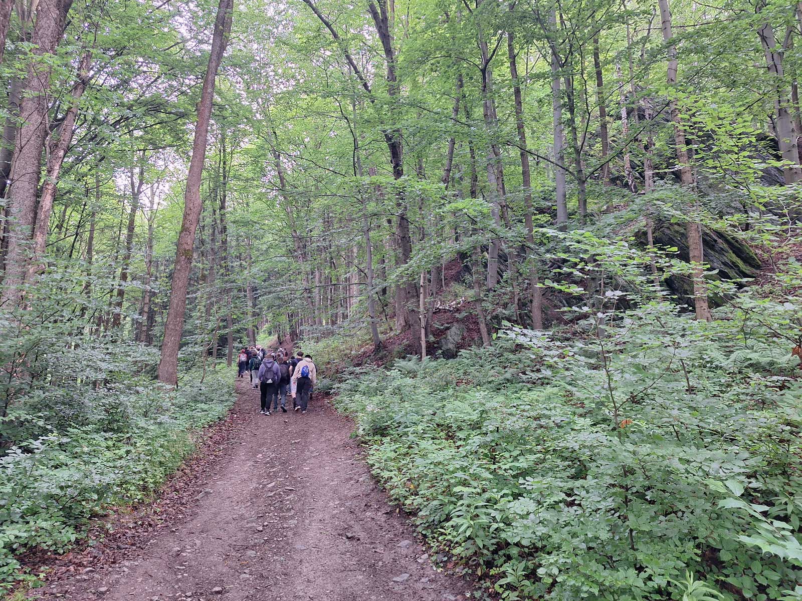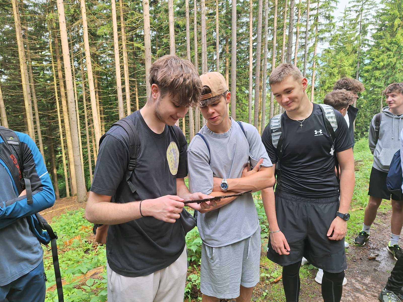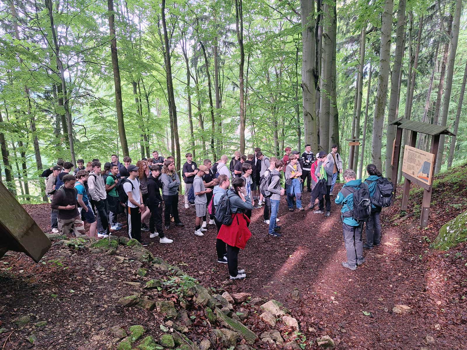 Po rychlém přesunu vlakem do Svobody nad Úpou si nás na nádraží vyzvedli dva lektoři enviromentální výchovy ze správy KRNAP. Pomalým tempem jsme se vydali na pochod do prudkého kopce až na Sluneční stráň. Po cestě nás čekalo mnoho zastavení s výkladem. Zajímavé bylo povídání o lesních druzích ptáků. Lektor pustil přes reproduktor zvuky ptáků, které přilákaly ostatní jedince. Zanedlouho s námi začali soupeřit, kdo lépe a hlasitěji zpívá. Také jsme se dozvěděli něco o kůrovci a navštívili i okolí Medvědí jeskyně.