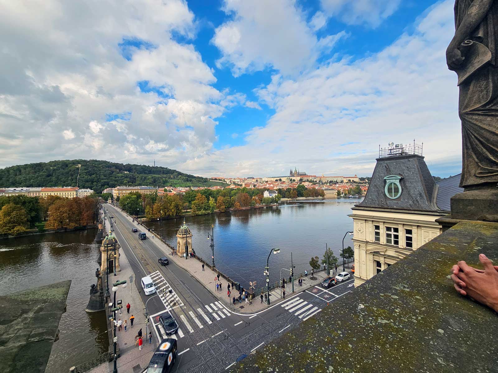 Poté jsme se přes Most Legií a Střelecký ostrov vydali Malou Stranou směr Pražský hrad. Po cestě nás čekalo pár zastávek, například u pomníku s bustou Josefa Dobrovského, který se nachází kousek do Werichovy vily, u Lennonovy zdi, ukryté mezi malými náměstíčky, ambasádami a Čertovkou, ve Sněmovní ulici, pamětní desky Winstona Churchilla a pamětní busty Tomáše Garrigua Masaryka. Zámeckými schody jsme došli až na Hradčanské náměstí, kde jsme se ještě se žáky pokochali výhledem na město a následně s kolegyní vyhlásily rozchod.