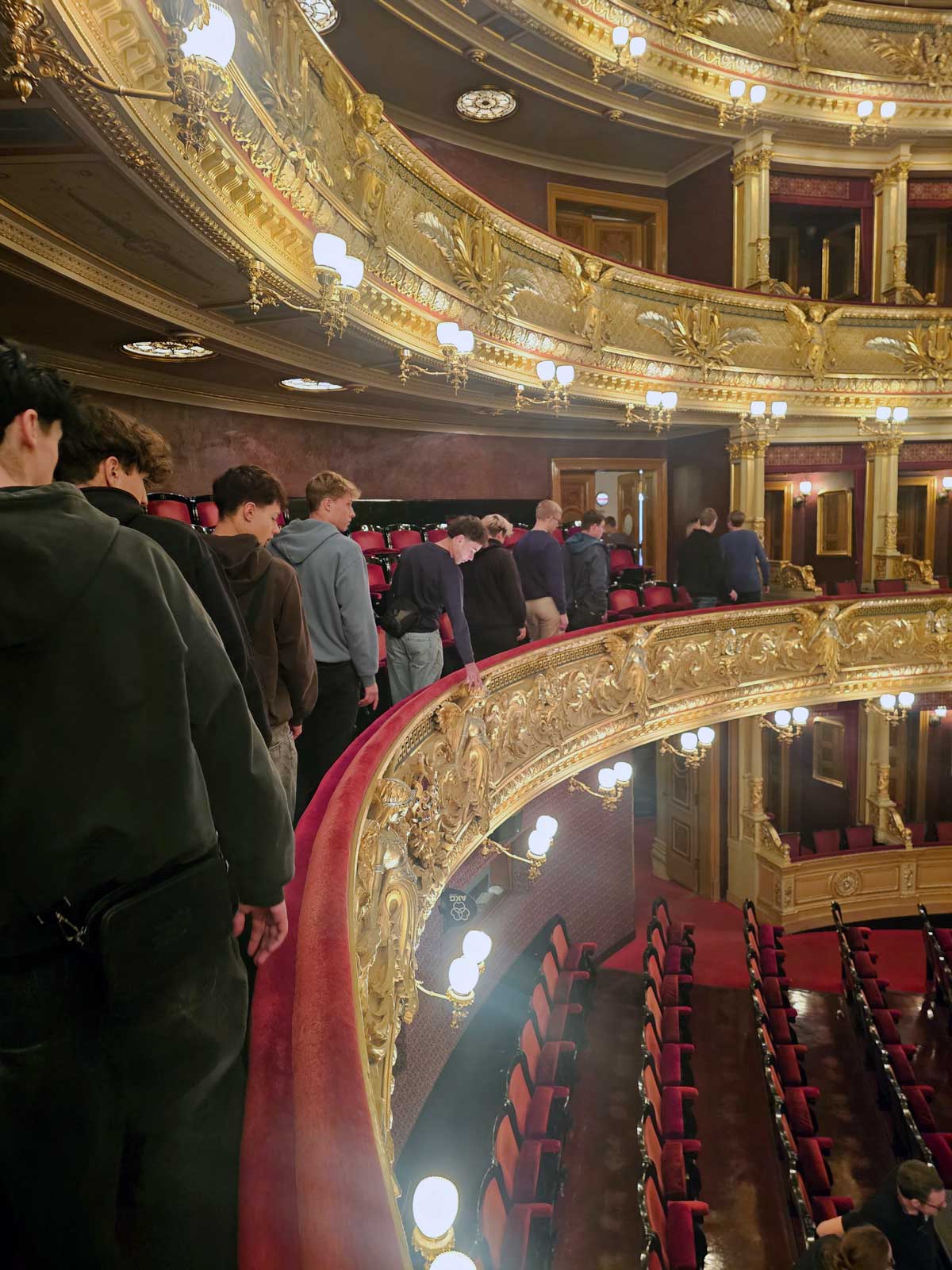 Samotnou prohlídku jsme vzali opravdu od sklepa, respektive od základních kamenů přes hlediště a jeviště, balkony, galerie až na střechu, odkud se nám naskytl neobvyklý pohled nejenom na ostatní střechy a terasy pražských domů v centru, ale i na pozůstatky Hladové zdi, Petřín a Pražský hrad, cíl naší další procházky. Příjemný výklad jsme s naším průvodcem zakončili v hlavním foyer, které zdobí lunety od Mikoláše Alše.