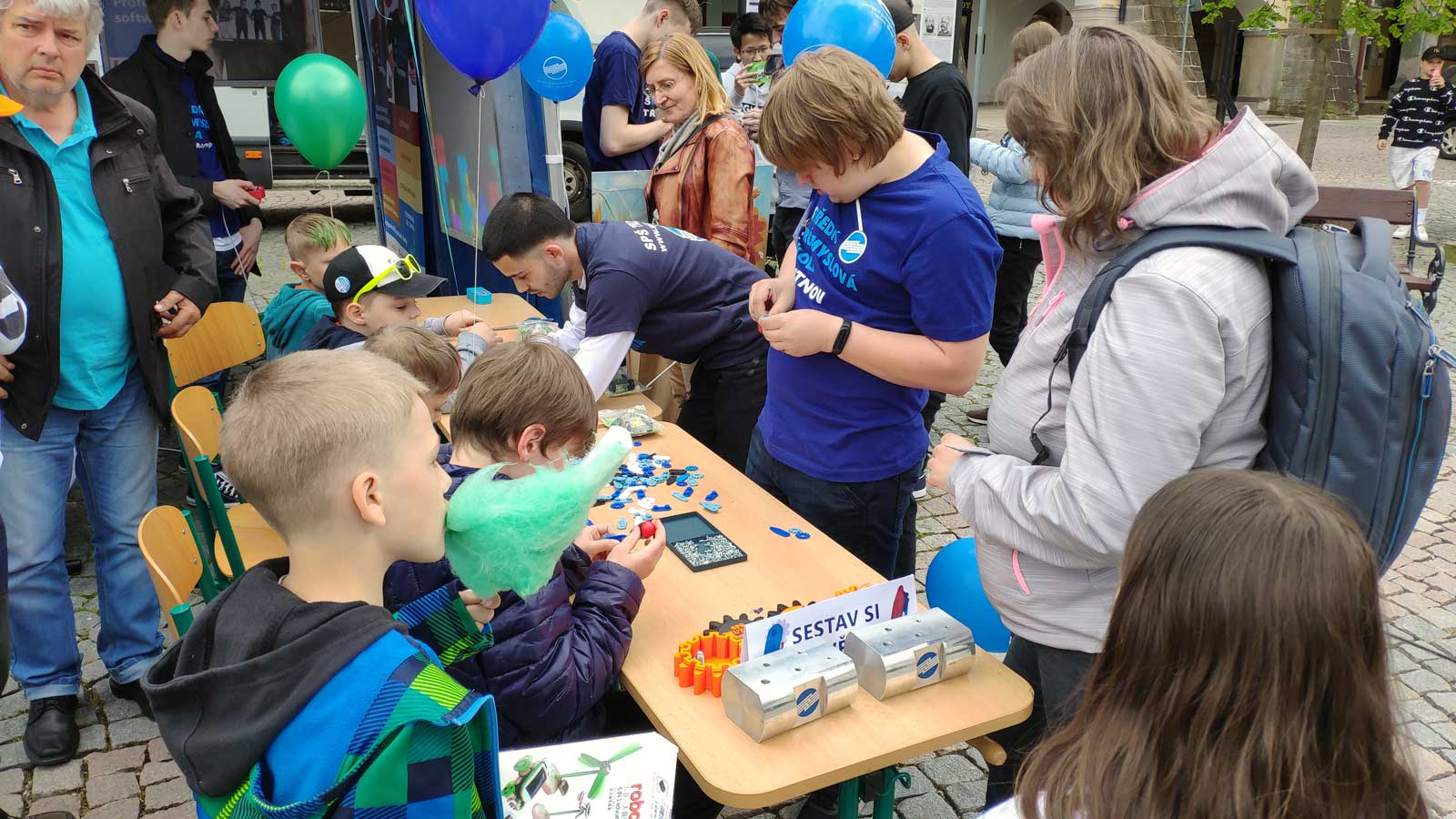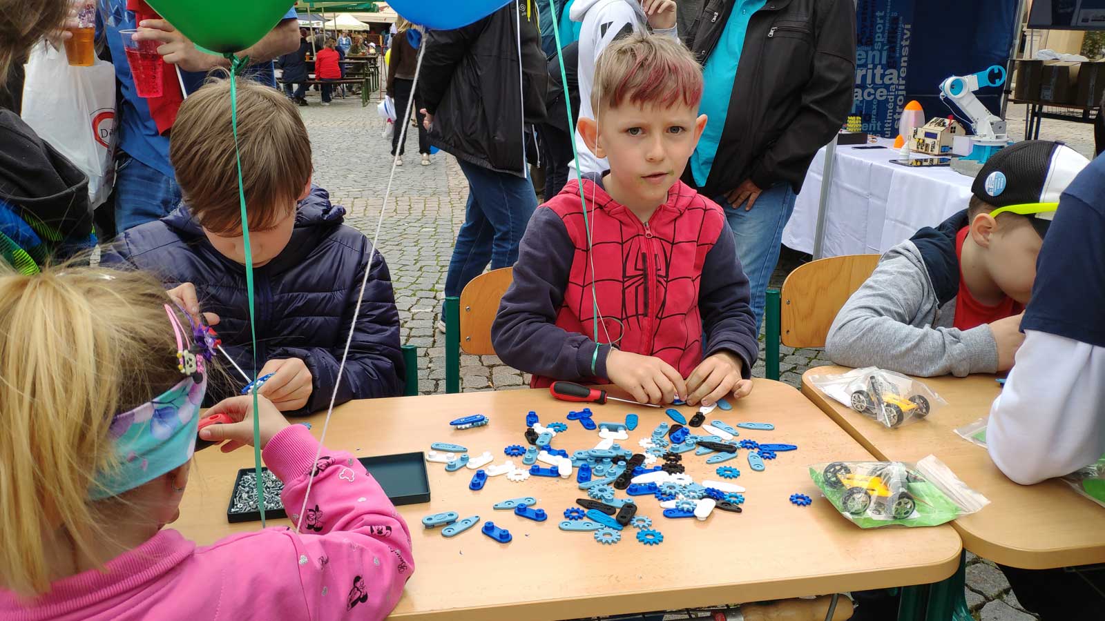 Ti nejmenší návštěvníci si u našeho stánku mohli s pomocí našich žáků sestavit klíčenku, solární autíčko a odnést si ho s sebou nebo si zasoutěžit ve šroubování různých velikostí šroubů na čas. Některým z nich udělal radost i samotný nafukovací balónek.