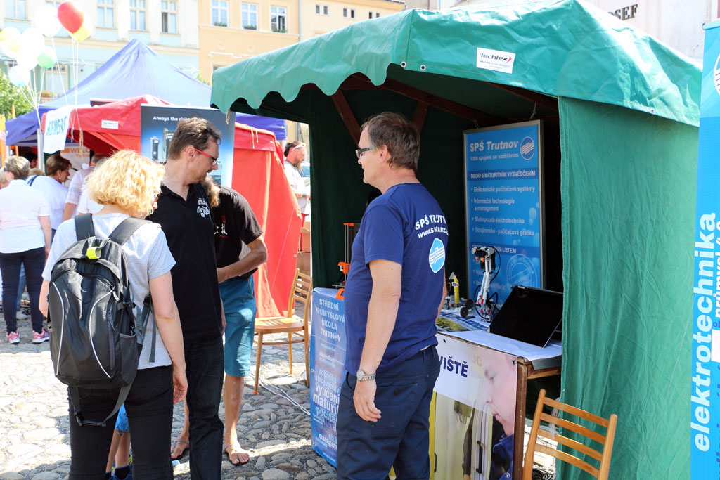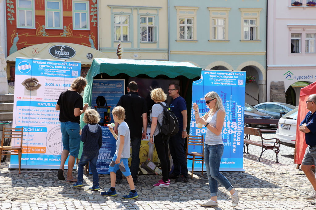 Při této akci se na trutnovském náměstí prezentovalo ve stáncích celkem 8 firem, které v současnosti zaměstnávají více než 4.500 zaměstnanců a naše škola. K vidění byl např. elektromobil včetně nabíjecí stanice, transformátory, tlumivky a další výrobky z výrobních programů vystavujících firem. Firmy návštěvníkům rozdávaly drobné dárky a ani na ty nejmenší se nezapomnělo a radost jim udělala třeba cukrová vata či nafukovací balónek.