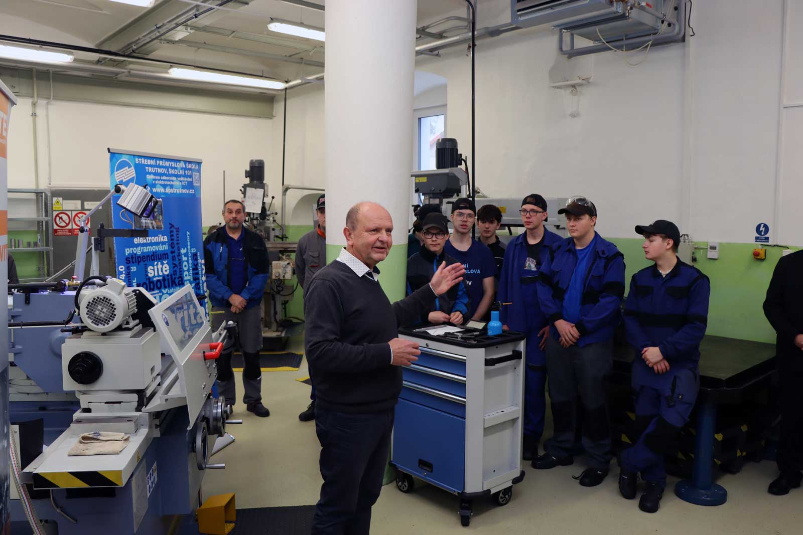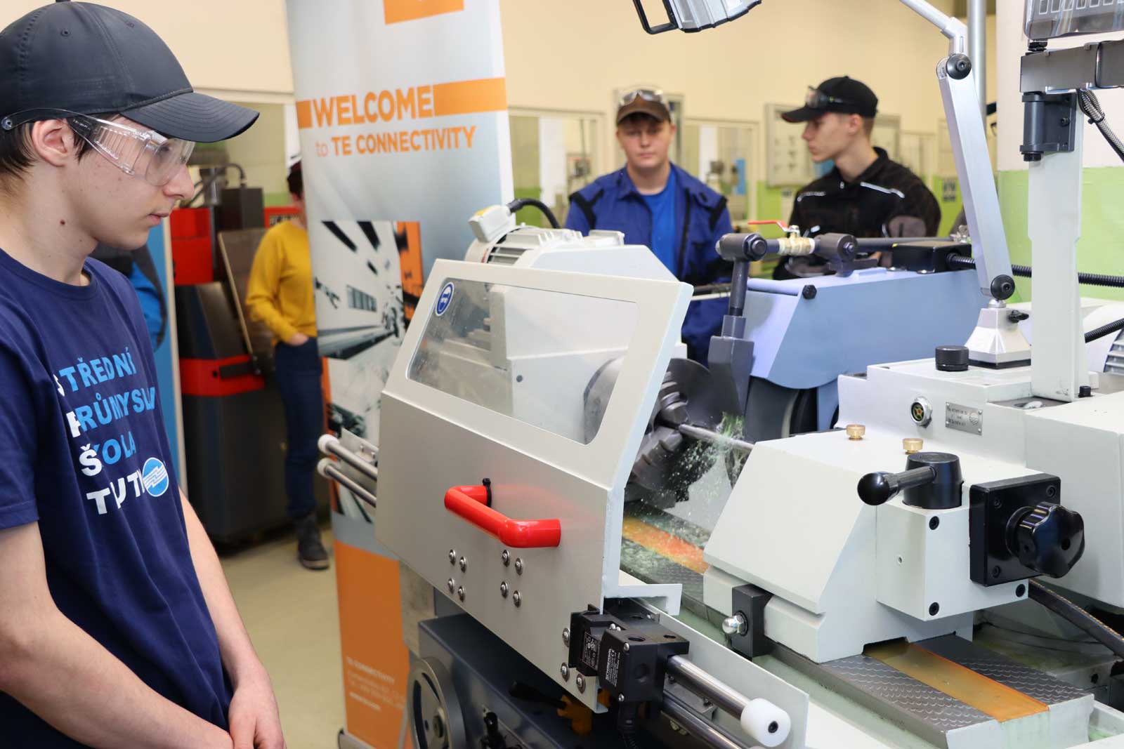 Po představení závodů TE Connectivity v Trutnově panem Danielem Hrnčířem seznámil žáky s možnostmi provádění praktické výuky ve společnosti a s uplatněním ve společnosti po ukončení studia žáky pan Otakar Sedláček. Následovala diskuze s přítomnými žáky. Po ní předvedl praktickou ukázku broušení hřídele žák druhého ročníku oboru Nástrojař Petr Nejezchleba.
