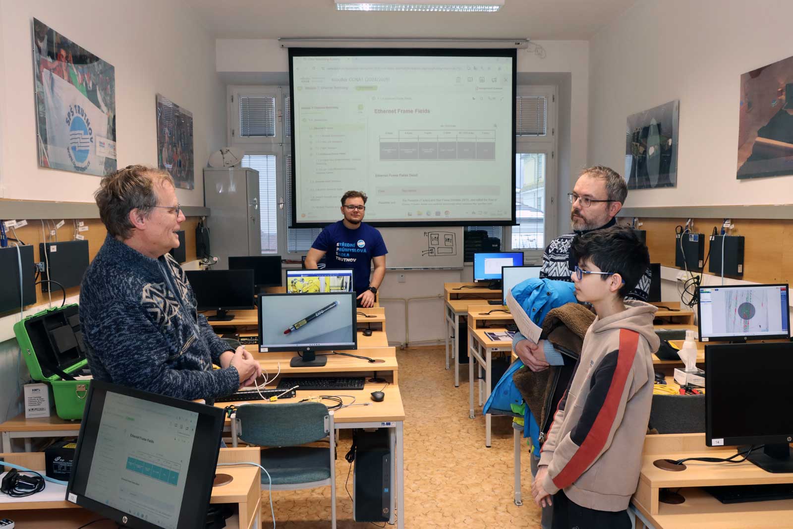 Na pracovišti ve Školní 101 byla opět zajímavým tématem ukázka tisku na 3D tiskárnách, využívaných ve spojení s výukou modelování a konstruování v profesionálních CAD systémech nebo simulátor chytré domácnosti (IoT) v podobě malého modelu obytného domu, prošpikovaného různými senzory s programovatelnou řídicí jednotkou, kterou lze využívat ve výuce. Nepřehlédnutelnou ukázkou, která se odehrávala v jedné s počítačových učeben byla ukázka výuky programování.