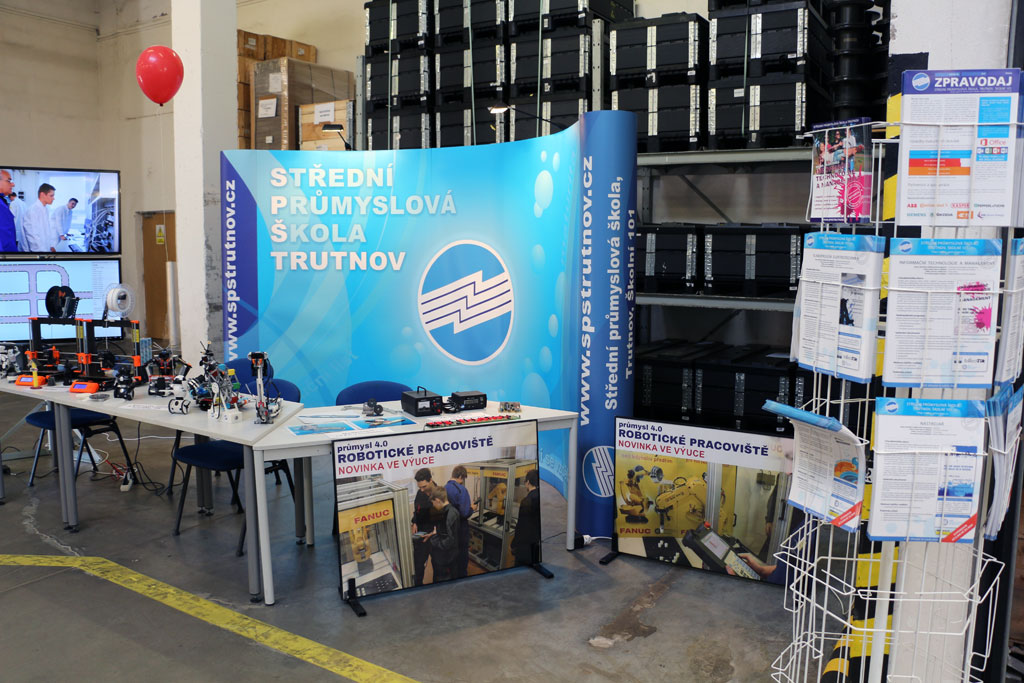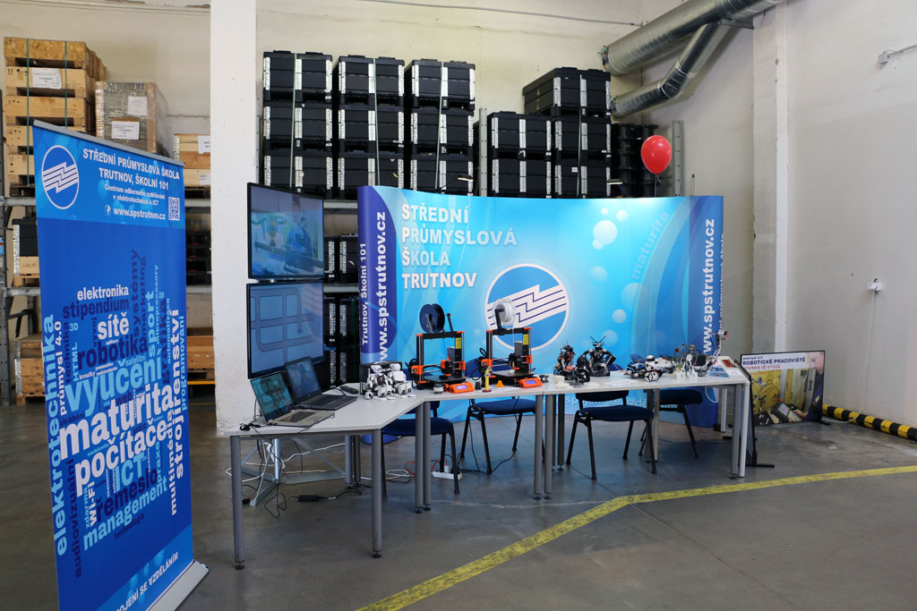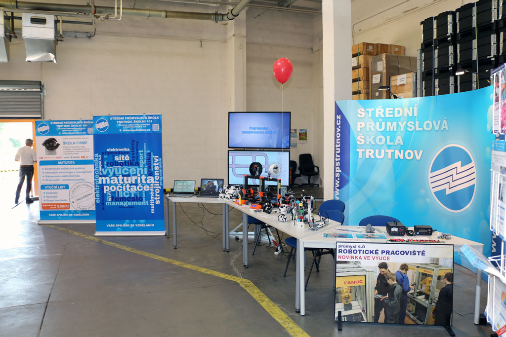 SPŠ Trutnov na prohlídku navázala svou expozicí 3D tisku a výrobků žáků z výuky a zájmových kroužků. Nutno říci, že oboje sklidilo úspěch. Zejména děti jistě nezapomenou na střet se zákeřným robotickým hadem, který snad vyvážila pohostinnost robota rozvážejícího po výstavní ploše tatranky. Náhlé nebezpečí rozrůstajících se seznamů vánočních dárků jsme odvrátili informacemi o kroužku robotiky, který naše škola bezplatně poskytuje zájemcům ze základních škol.